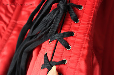 Gorset wiązany jest czarnym, płaskim sznurkiem, który nie rozciąga się i poprawnie spełnia swoją funkcję. To według mnie najlepszy rodzaj sznurka. Końce zostały estetycznie zabezpieczone tulejkami.